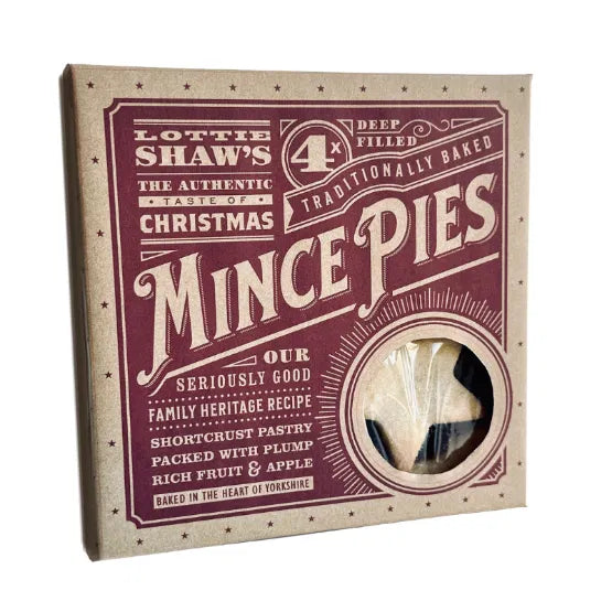 Lottie Shaw's Traditional Mince Pies ( 4 pk ) from 550 /per Add to Bag This Lottie Shaw's traditional mince pie box contains 4 mince pies, baked with luxury mincemeat and sweet pastry. STOCK LEVEL | 7