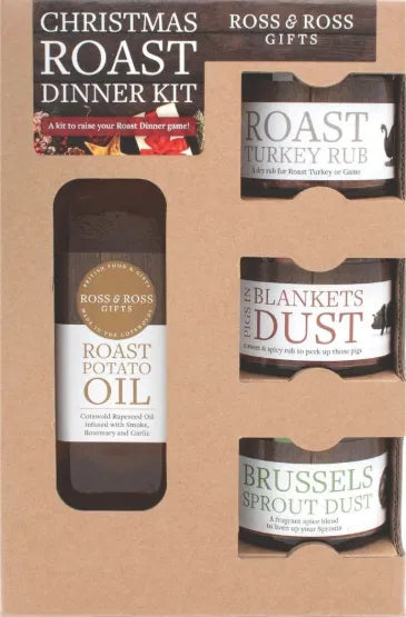 A kit to raise your festive dinner game, containing roast turkey rub, pigs in blankets dusts, sprouts dust & roast potato oil