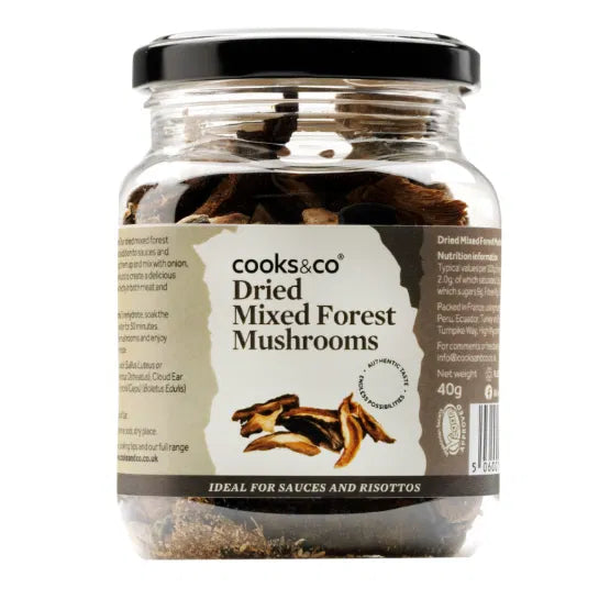 Cooks & Co Dried Forest Mushrooms from 440 /per Add to Bag These dried mixed forest mushrooms are a great addition to sauces and risottos. To rehydrate, soak the mushrooms in boiling water for 30 minutes. Drain, rinse and dry the mushrooms and enjoy them in your favourite recipe. 40g STOCK LEVEL | 9